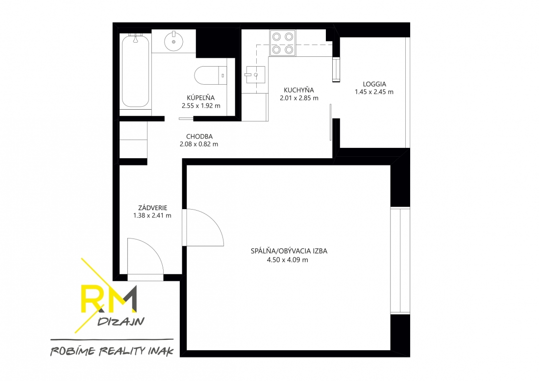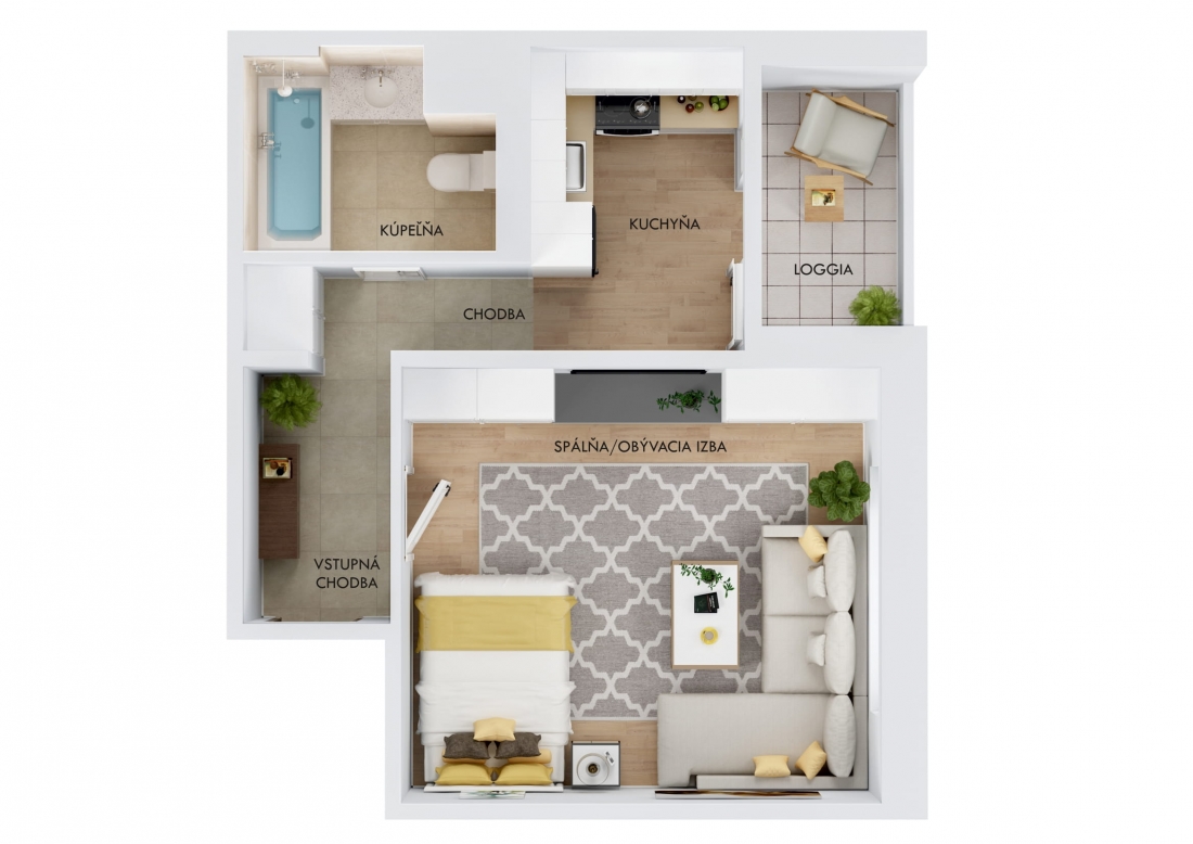 Dispozičné riešenie: vstupná chodba, samostatná izba, kuchyňa s veľkým francúzskym oknom s výstupom na loggiou, kúpeľňa s vaňou spojená s WC