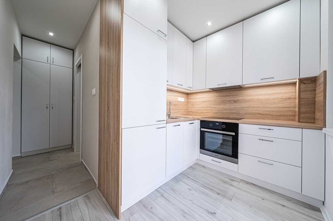 -kuchynská linka robená stolárom na mieru so zabudovanými spotrebičmi (sklokeramická varná doska, elektrická rúra, digestor, chladnička s mrazničkou) – všetko v záruke
