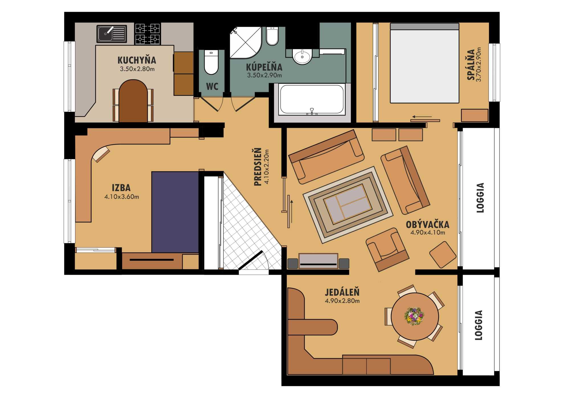 - 2 x loggia o rozlohe 7 m²