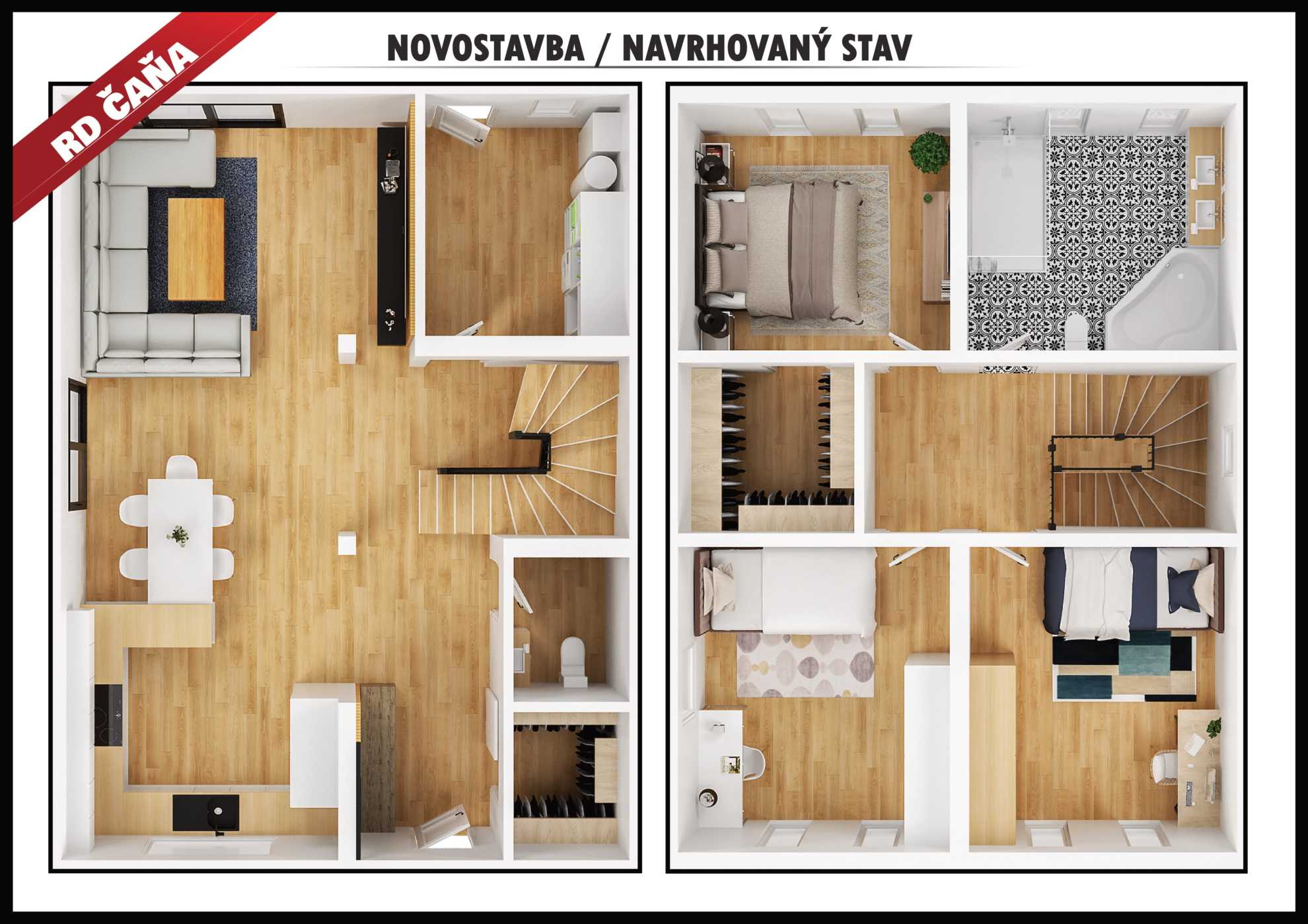 2. nadzemné podlažie (2.NP): chodba, kúpeľňa, spálňa so šatníkom, 2 x izba