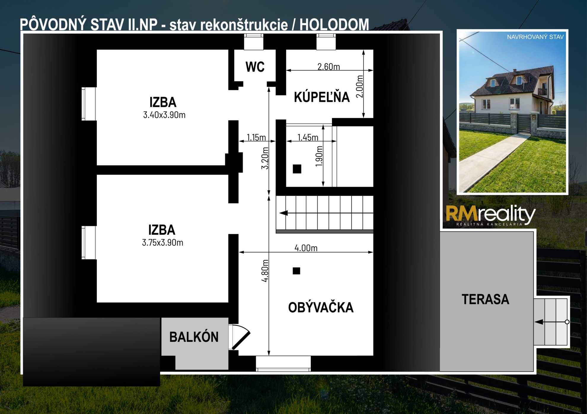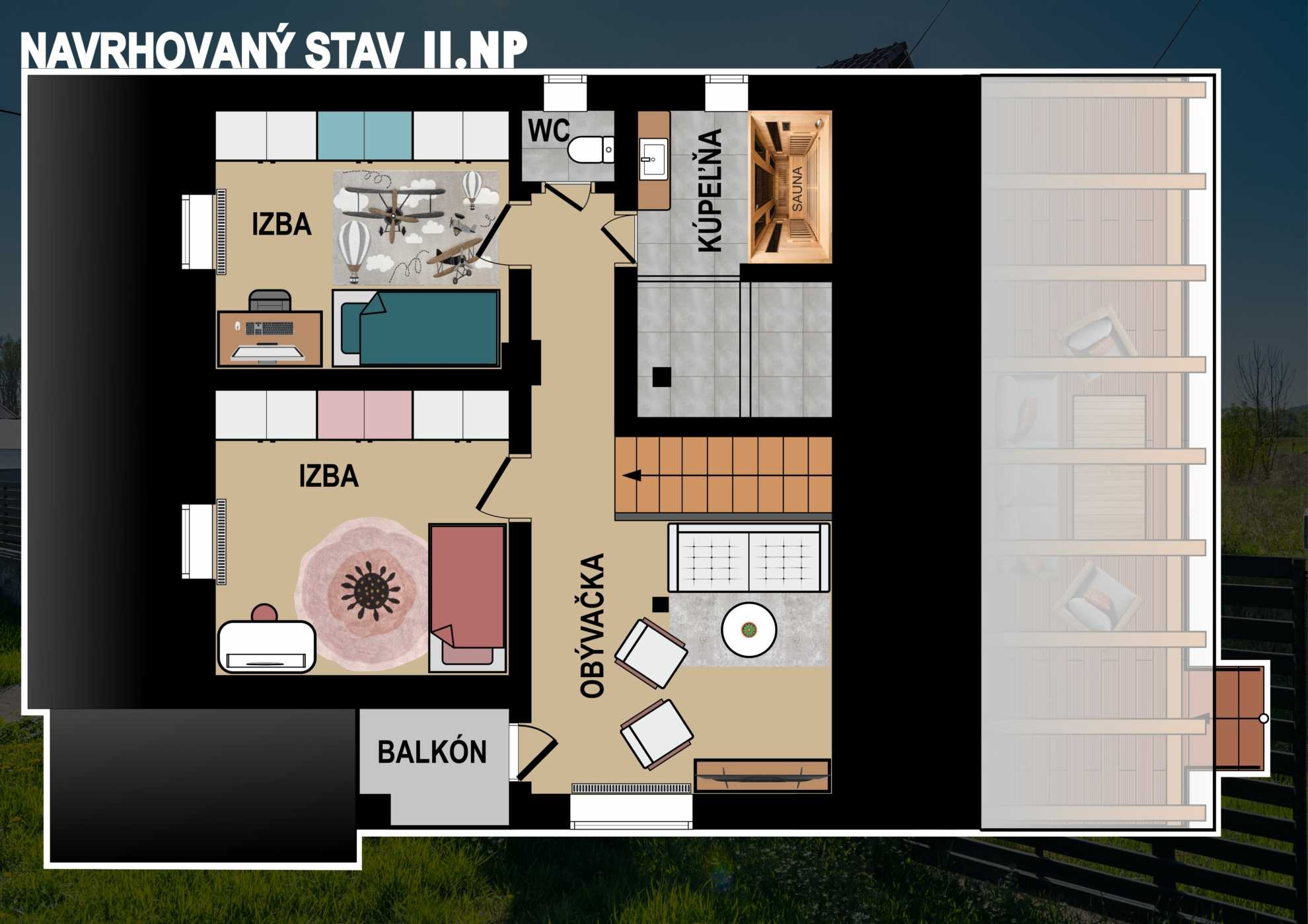 2. nadzemné podlažie: 2 samostatné izby, obývacia časť / spoločenská miestnosť, kúpeľňa + WC, sauna, balkón