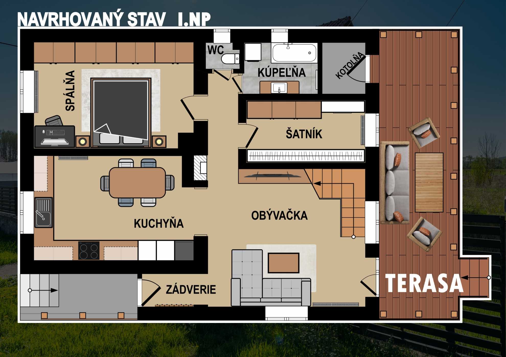 1. nadzemné podlažie: vstupné zádverie, priestranná obývacia izba s výstupom na terasu, kuchyňa s jedálňou, spálňa, šatník, kúpeľňa + samostatné WC, technická miestnosť (kotolňa)