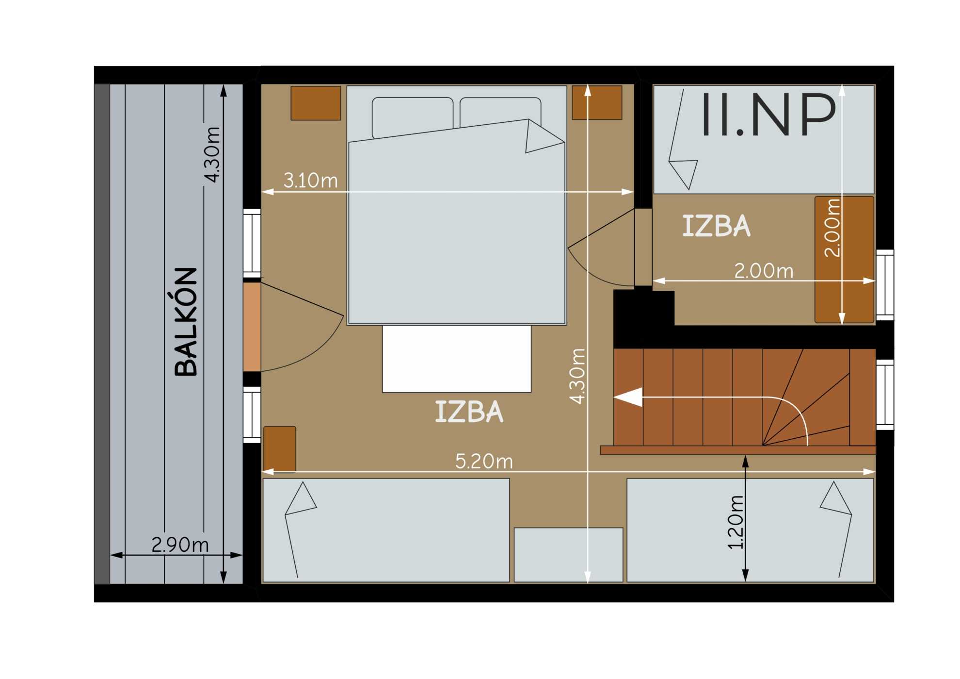 II. nadzemné podlažie pozostáva z dvoch izieb s balkónom a s krásnym výhľadom na okolitú prírodu.