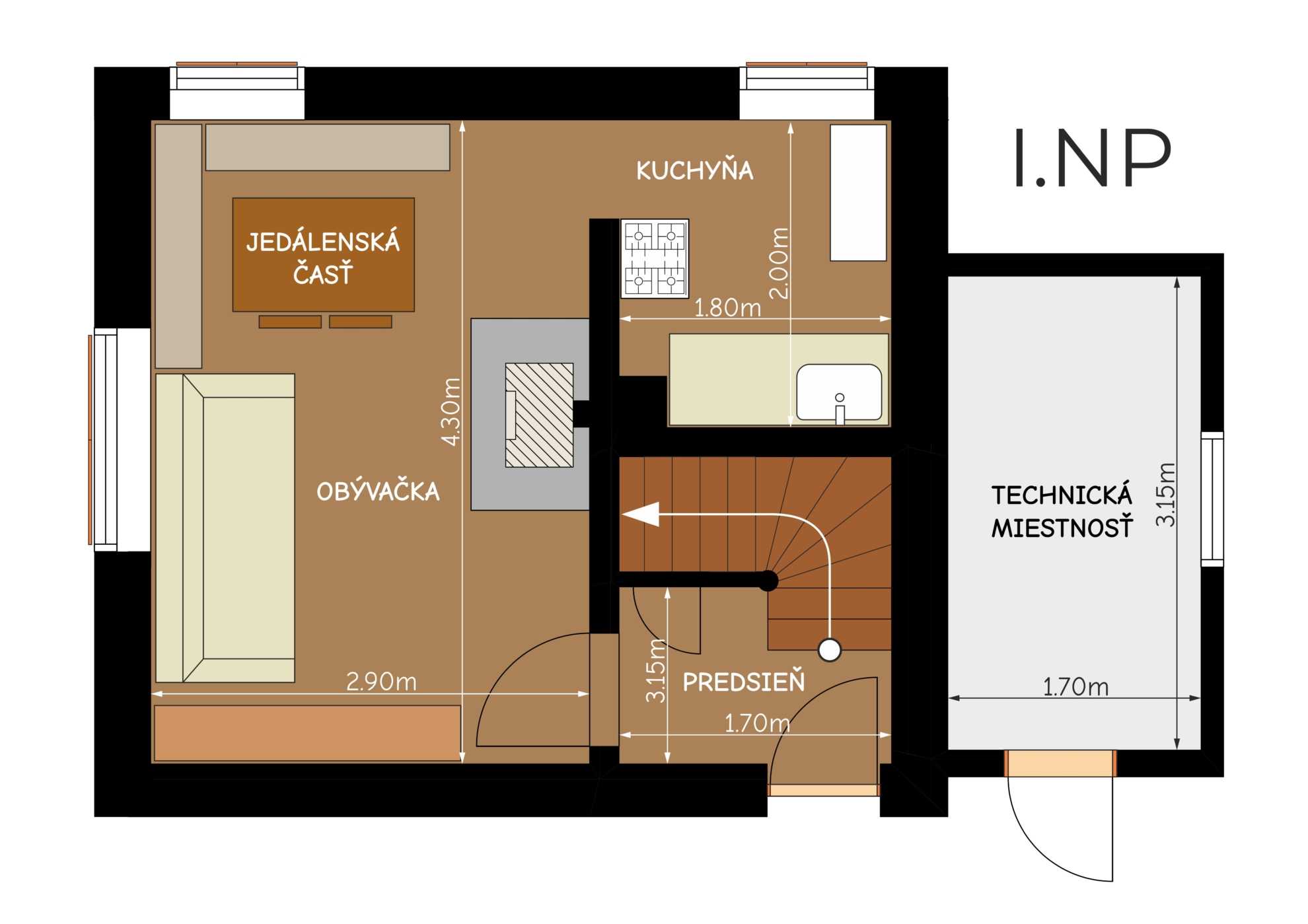I. nadzemné podlažie pozostáva z predsiene a obývacej izby s prechodom do kuchyne. V predsieni je schodisko s výstupom na II. nadzemné podlažie.