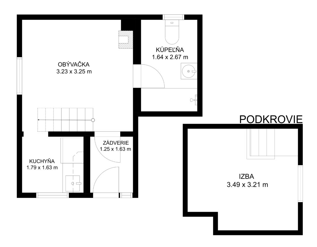 Dispozícia: vstupná predsienka, obývačka s krbom, kuchyňa a kúpeľňa a podkrovie tvorí jedna izba